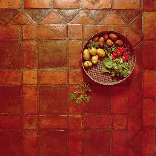 Broad Lattice Centre Square: 8 x 8 x 1" (20.4 x 20.4 x 2.5 cm) Corner square: 4 x 4 x 1" (10.2 x 10.2 x 2.5 cm) Border: Red and brown dogtooth.